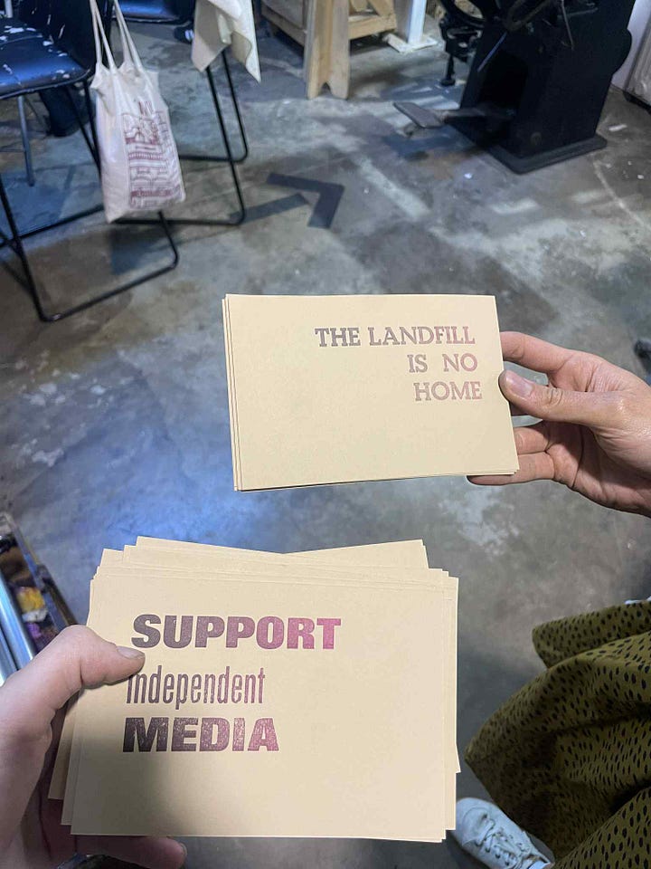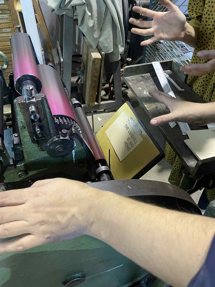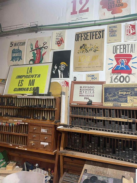 The UK’s cultural scene is coughing up blood. Independent venues who made it through the pandemic had no financial reserves when the energy crisis hit. In my roaming around Barcelona, I can’t help but ask: how does a space like this - La Impremta Col·lectiva - exist? Barcelona is no stranger to gentrification, it makes London’s housing crisis seem like a walk in the park (and I don’t say this lightly). Yet this print shop embodies what makes cities good to live in: accessible arts and culture, connecting with new people, feeling part of something bigger. It is a space of enjoyment and resistance, a crossroads where movements, artists and the city converge.