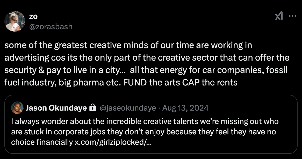 In the UK, if you want to pursue art as a means to live, you generally have to move to London and sell your soul to pay rent. My best friend’s mum went to art school in the 1980s with the likes of Tracey Emin and Damien Hirst. They all lived in East London squats which no longer exist. The starving artists are actually starving. Unless you have existing capital, your choices are pretty much work for Spotify or face homelessness. The great creative minds of our time either don’t work in the arts or are content creators for oil companies.